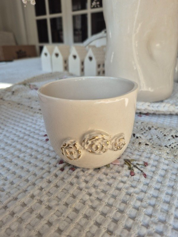 Cuenco alto de cerámica artesanal con apliques de rosas y oro real. 250cc / 9 x 8cm