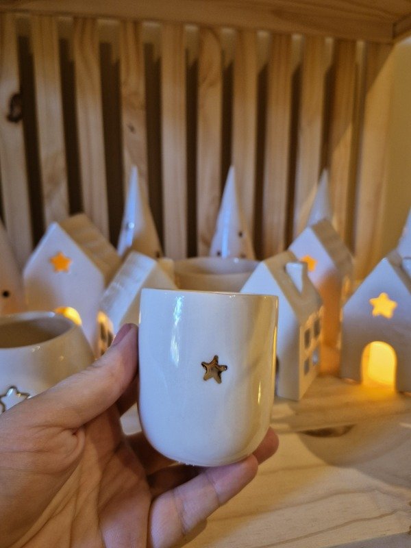 Vasitos de cerámica artesanal con detalle en oro. Ideales para velas y souvenirs 140cc / 6,5 x 7,5 cm