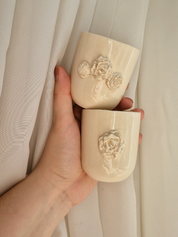 Vasitos de cerámica artesanal con detalle de rosas. Ideales para velas y souvenirs 140cc / 6,5 x 7,5 cm