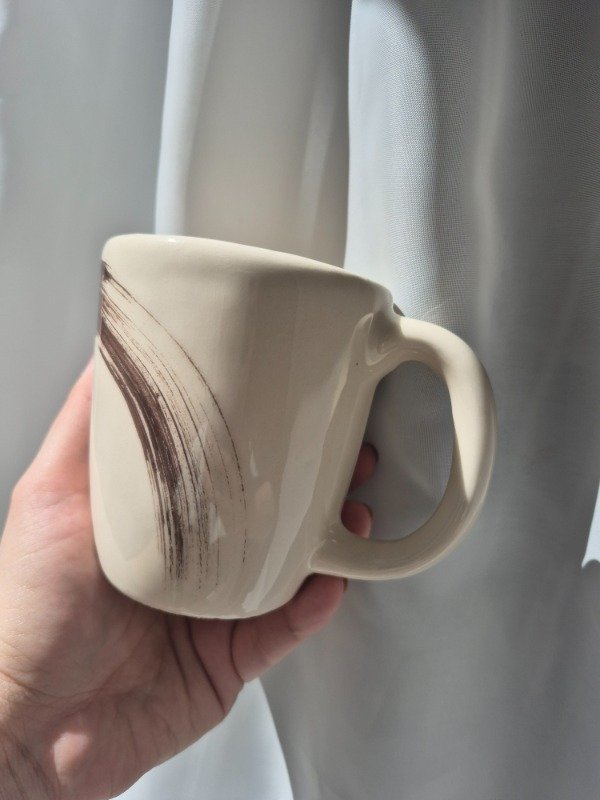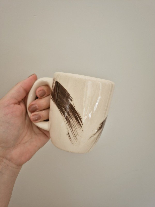 Taza de cerámica artesanal con pinceladas e chocolate. 300cc de capacidad y medidas de 12 x 10cm. Apto microondas