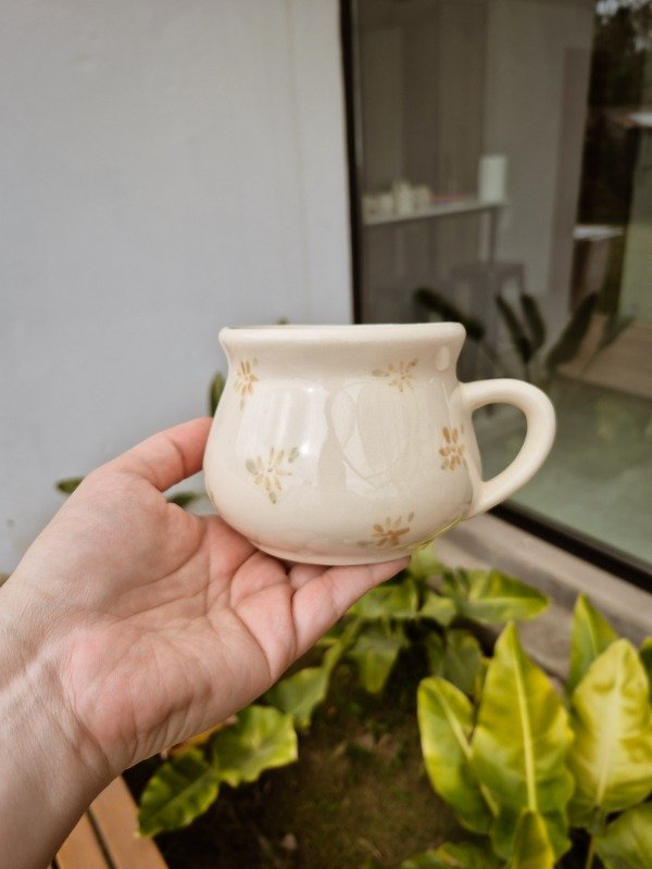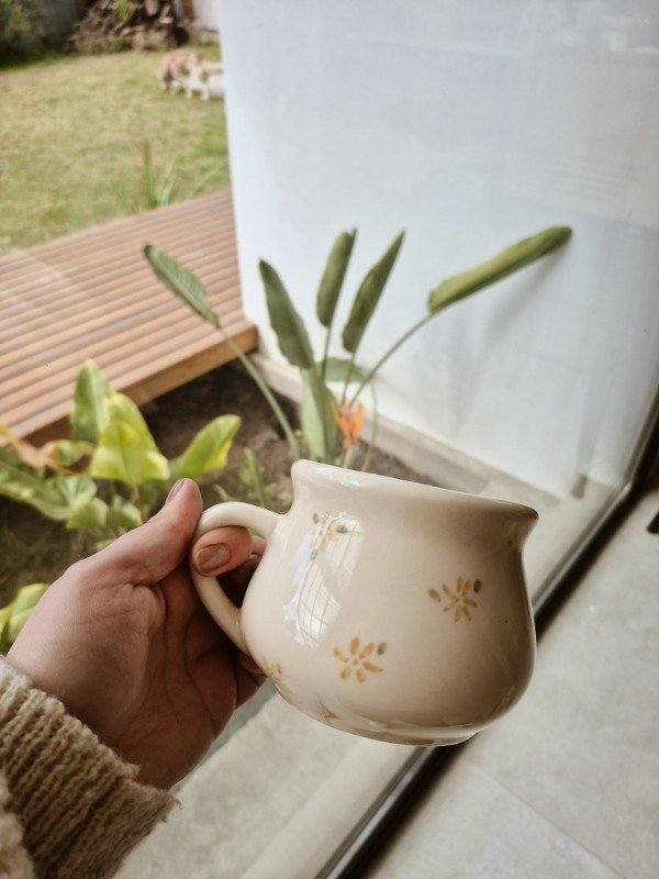 Taza de cerámica artesanal con florcitas pintadas en beige. 400cc de capacidad y medidas de 14 x 10cm. Apto microondas
