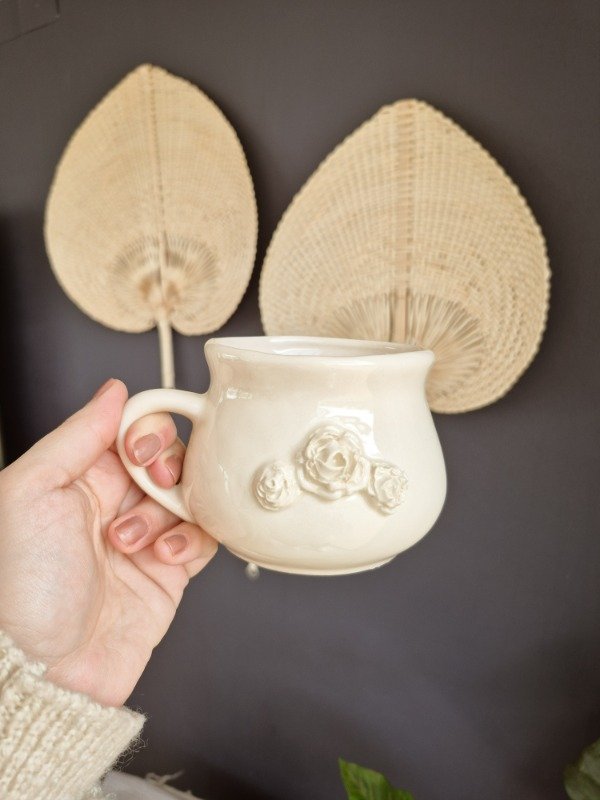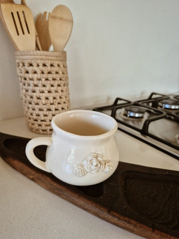 Tazón de cerámica artesanal con aploques de rosas. 400cc de capacidad y medidas de 14 x 10cm. Apto microondas
